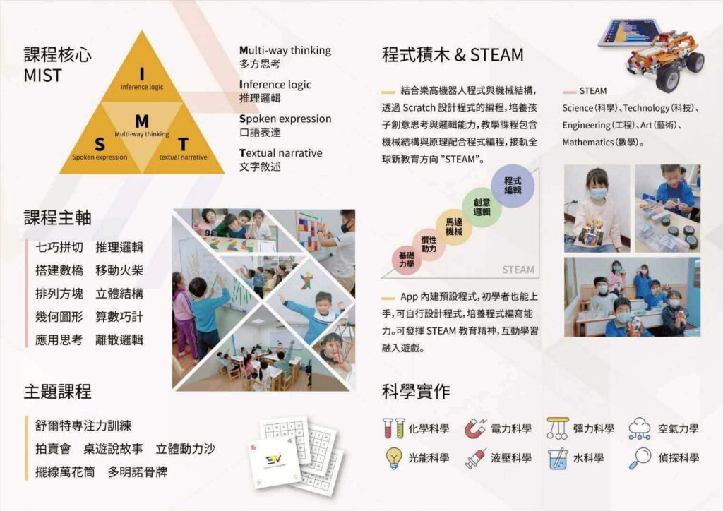 關於我們 About US 用心傾聽,陪伴學習,是昕威數學教育的初衷教育的路途中,我們遇見了千差萬別的孩子,也因如此,在教育現場常會有意想不到的狀況發生,儘管如此,老師們會想盡一切辦法來解決問題。現行的教育體制,我們必須與予尊重,畢竟在台灣的教育普及程度是遠遠超越很多國家,但我們更加在意,能夠讓孩子們如何能有更好的學習視野、學習動力、學習態度。並不是衝擊體制,打破規則,要用不同的面向來引導,與輔助孩子們。學前教育最為重要是促進身心認知、語言、情緒等全面發展,這階段教育涵蓋遊戲、生活習慣、人際互動與探索,為未來學習打下基礎。昕威數學在學前至小學階段,規劃了一系列課程,互動式的學習方式能夠激發孩子們的學習動力,過程中更能互相激勵成長,讓孩子從遊戲中學習數學。玩中學,學中文,積木學數學,Brain Max數學桌遊,M.I.S.T.邏輯思維數學,三大主題課程。集合了多位老師教學現場的教育經驗編纂而成,培養與訓練數學三大能力,思考能力,執行能力,創造能力。 合作分校 所有分校 寒暑期營隊班私立愛學習文理語文數學心算短期補習班 桃園市大溪區員林路一段229號1樓(部分)及2-4樓 03 380 9885 寒暑期營隊班, 數學班, 桌遊合作校微笑太陽短期技藝補習班 新北市中和區景平路622號 02 2242 6982 寒暑期營隊班, 數學班, 桌遊合作校幼強文理語文短期補習班 新北市土城區延吉街106巷15號 02 2262 5827